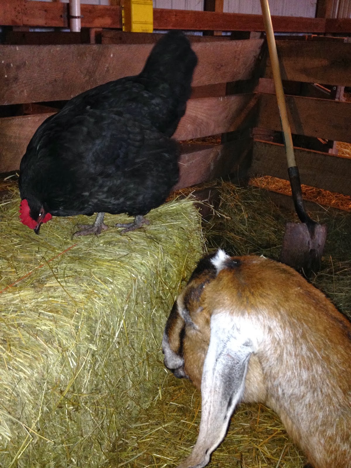 When our goat Goldie injured her shoulder and was unable to walk anymore she was confined to one stall. We used a chain hoist and a hammock to lift her up everyday. One of our chickens displayed an act of kindness you'd never expect from a chicken. The chicken stayed in the stall with the goat the whole time.