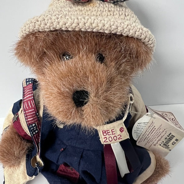 This collectible Boyds Bear from 2002 captures Americana charm with authentic period details. Libbee arrives dressed in a patriotic outfit paired with a cozy tan knitted hat—a nostalgic nod to classic American style. Crafted exclusively for Longaberger Basket Company, this limited-edition bear combines quality craftsmanship with collectible appeal. Perfect for Boyds enthusiasts, Americana lovers, or anyone seeking a meaningful piece of vintage Americana décor. A timeless addition to any collection. She has tote bag and a ribbon with BEE 2000 hanging from her neck. On her bottom paws she has an embroidered American flag on one paw and a basket on the other.
