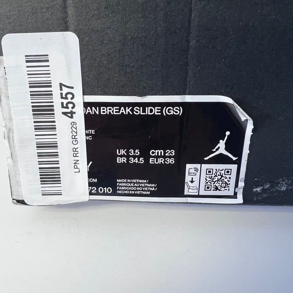 Elevate your sneaker game with these iconic Jordan Break Slides in youth size 4. Featuring a sleek black colorway accented with the signature white Jumpman logo, these slides deliver classic Jordan style with everyday comfort. The synthetic leather upper strap ensures durability and easy maintenance, making them perfect for casual wear, post-game relaxation, or weekend outings. A timeless addition to any young sneaker enthusiast's collection. Never worn. Original box included.