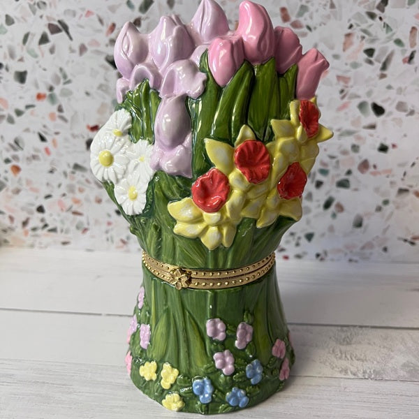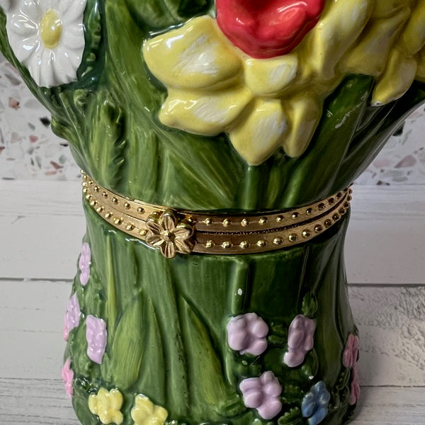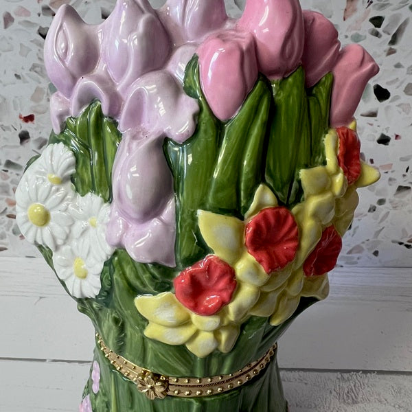 This charming vintage ceramic trinket box from 1999 captures the timeless beauty of a spring garden. Hand-painted with delicate tulips, roses, daisies, and wildflowers, each piece showcases the artistry of GAC's craftsmanship. The hinged top opens to reveal a perfect spot for storing jewelry, keepsakes, or small treasures. A nostalgic accent for collectors and a thoughtful gift for anyone who loves botanical details and vintage charm.