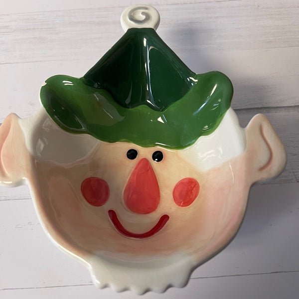 Charming vintage ceramic dish featuring a cheerful elf with a green hat—perfect for holding candy, trinkets, or small treasures on a shelf or desk. Measuring 6.5" x 5.5" x 2" high, this Boston Warehouse piece brings whimsical character to any room. As a preowned item, it carries authentic vintage charm, including a small paint chip and crazing in the glaze that add to its one-of-a-kind appeal. An ideal gift for collectors of quirky ceramics or anyone who loves nostalgic holiday décor year-round. This offering is for the candy dish only.