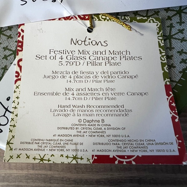Celebrate the season in style with this festive set of four glass canapé plates, each featuring a vibrant holiday pattern in classic red and green. Crafted by Crystal Clear, a trusted division of The Jay Company, these 5.79-inch plates are perfect for entertaining during holiday gatherings. Mix and match with your existing dinnerware to create a festive tablescape, or use them for appetizers, desserts, and small bites. Their elegant design and durable glass construction make them an ideal addition to your holiday entertaining collection—and a thoughtful gift for the host or hostess in your life.