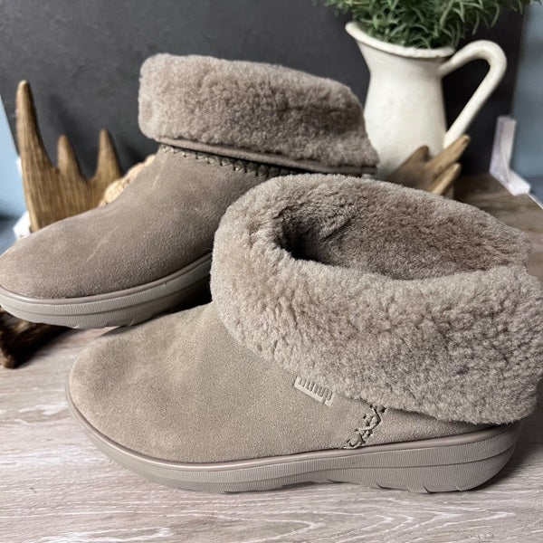 FitFlop Mukluk Shorty Suede Shearling Booties in taupe offer cozy comfort with signature ergonomic support. These gently used booties feature soft suede and plush shearling lining, perfect for keeping feet warm through winter. The cushioned footbed reduces strain on joints while the lightweight design makes them ideal for everyday wear. Women's Size 5 US. A smart choice for anyone seeking quality footwear that doesn't compromise on comfort or style. This item does not contain the original box. Boots only.
